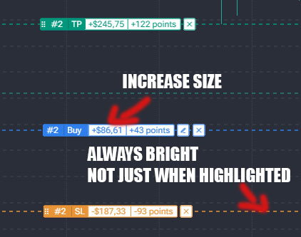 To give me the option to adjust how dim / bright the TP, entry, SL lines are at all times. Not jus when highlighted.
