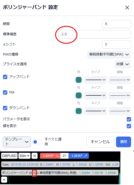 The deviation value of bolinger band is rounding up on 5 and rounding down on 4. But I think that the indicator in chart is resulted in the right value.